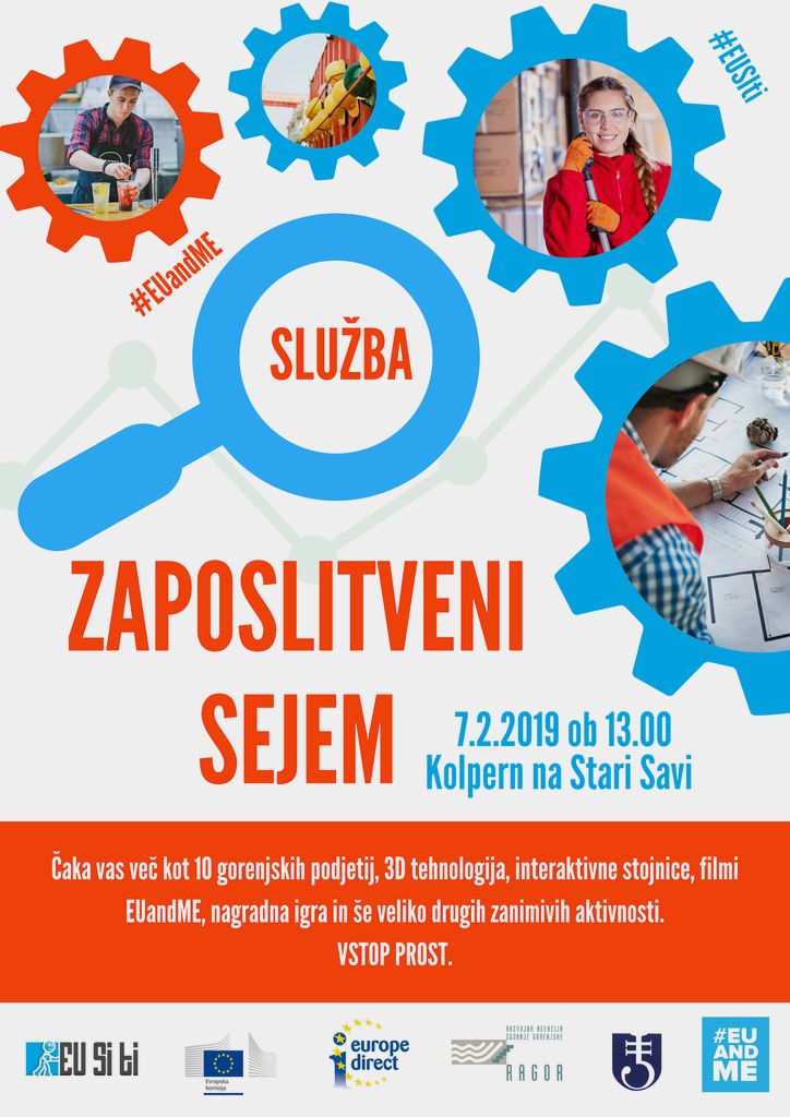 V četrtek, 7. februarja 2019, bo med 13.00 in 16.00 uro v Kolpernu na Jesenicah potekal tretji Zaposlitveni sejem. Letos v znamenju kampanje EU SI ti, s katero po slovenskih mestih predstavljamo številne prednosti Evropske unije in spodbujamo temeljno debato o EU – njenih vrednotah, solidarnosti, strpnosti ali aktualnih evropskih temah v regijah. Spodbujanje podjetništva, inovativnosti, zaposlitvene možnosti ter aktivacija mladih so področja, kjer je Evropska unija zelo dejavna, zato vas vabimo, da jih odkrijete.