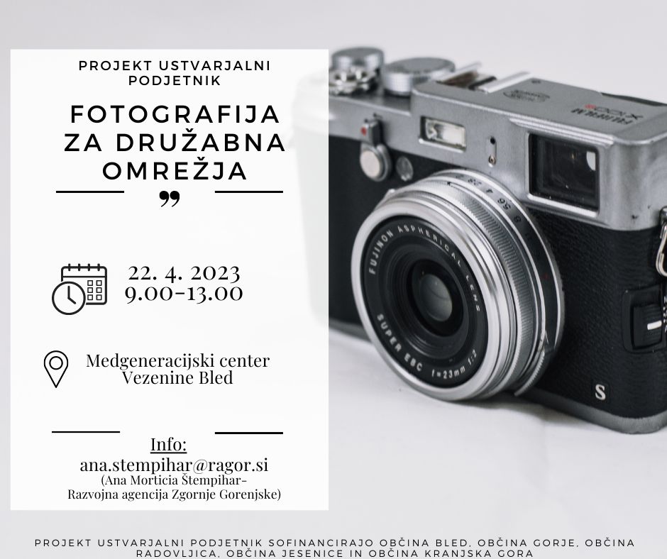 V soboto, 22.4.2023 bo od 9.00 do 13.00 v Medgeneracijskem centru Vezenine Bled potekala delavnica >>Fotografija za družbena omrežja<<pod mentorstvom Studia Slog.