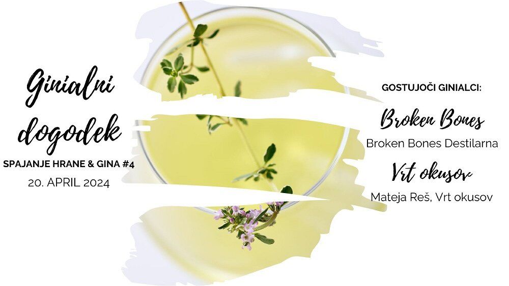 Večerja z gini, četrtič, #4. V Hotelu Triglav na Bledu ponovno spajamo hrano in gin. V goste prihaja družinska destilarna Broken Bones z mnogokrat nagrajenim asortimanom, ki ga proizvajajo v Ljubljani. Za zeliščno povezavo mešanih pijač in kuharskih mojstrovin bo poskrbela Mateja Reš z Vrta okusov, Aleš Fende v kuhinji bo z ekipo sestavljal krožnike, Danijel Galjot Galjo pa bo miksal, odmerjal in spajal koktejle s pripadajočimi jedmi.