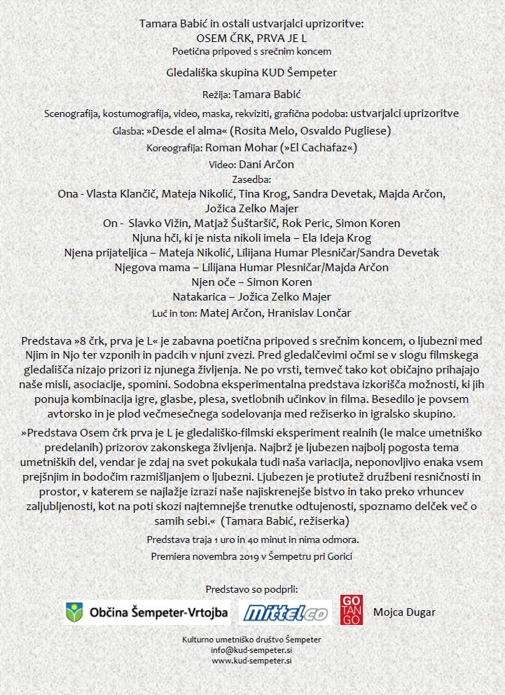 Kulturno društvo Bohinjska Bela vabi na predstavo z naslovom Osem črk, prva je L, v izvedbi gledališke skupine KUD Šempeter. Predstava je za abonma in izven, 10.2.2023 ob 19:30 uri v Domu krajanov na Bohinjski Beli. Vabljeni!