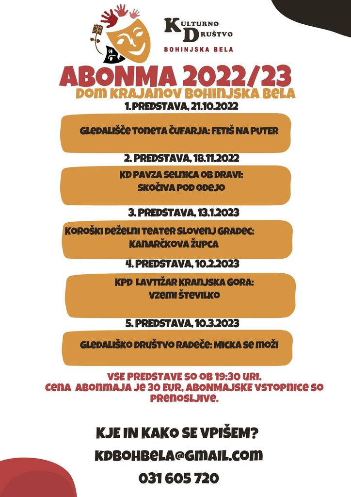 Kulturno društvo Bohinjska Bela je po dveh sezonah premora ponovno pripravilo gledališki abonma, v katerem si boste lahko v Domu krajanov ogledali 5 predstav ljubiteljskih gledališč.