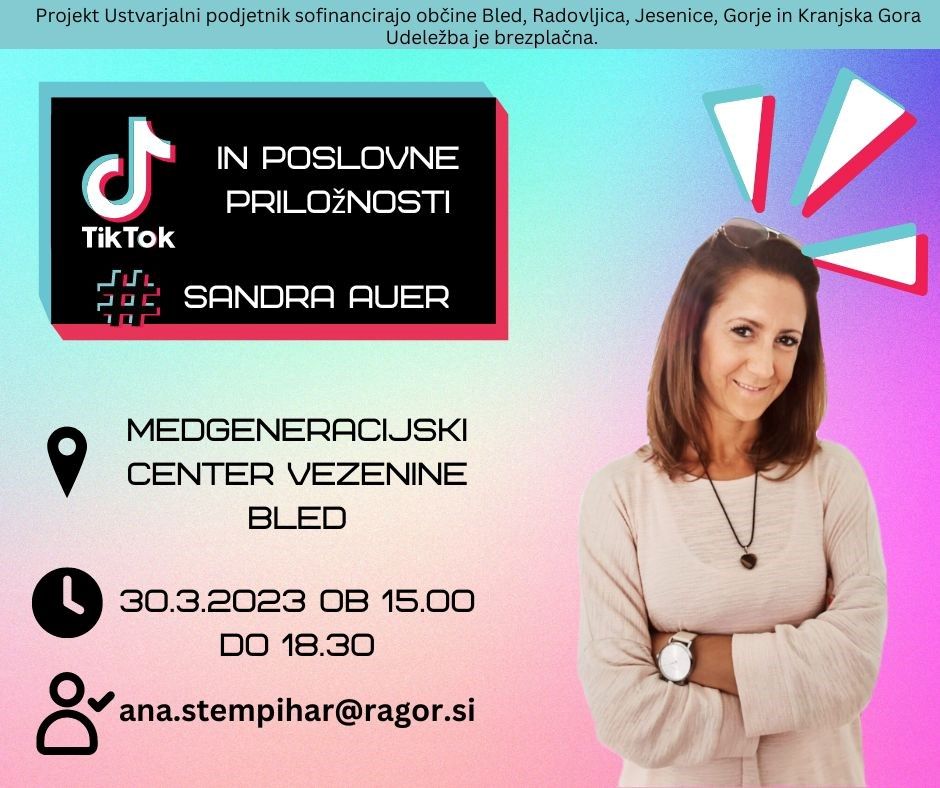 V četrtek, 30. 3. 2023 bo od 15.00 do 18.30v Medgeneracijskem centru Vezenine Bled (Ulica Jule Vovk Molnar 2), 4260 Bled potekala delavnica >>TikTok in poslovne priložnosti<<s Tiktokerko Sandro Auer.