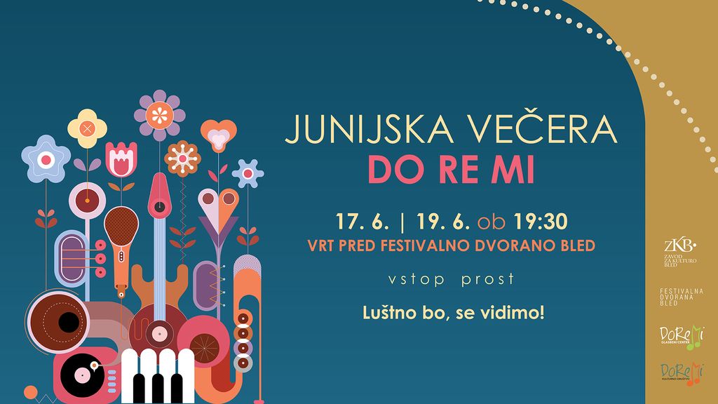 Glasbeni center DO REMI vas z veseljem vabi na 1. JUNIJSKI VEČER DO RE MI pred Festivalno dvorano Bled, ki bo potekal v torek, 17. junija 2025, ob 19.30 uri.