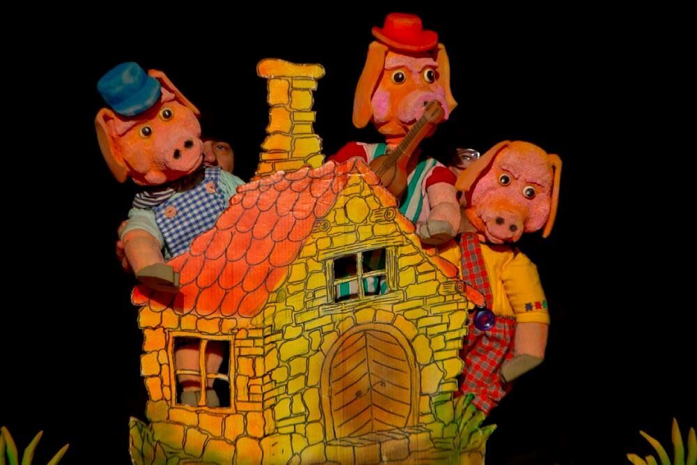 Trije prašički zapustijo varno domače ognjišče in gredo v svet iskat srečo ter si ustvariti svoj lastni dom. Pred hudobnim in požrešnim volkom se skrijejo v svoje hišice, narejene iz slame, vejevja in kamenja. Nauk lutkovne predstave je, da so lenoba, nepremišljenost in malomarnost slaba popotnica za življenje. Nad življenjskimi težavami in zlom, ki jih predstavlja požrešni volk, zmagajo le pamet, marljivost in iznajdljivost. Složnost, pomoč in dobrota v družini in do soljudi pa zagotavlja v življenju uspeh, zadovoljstvo in srečo, ki jo je treba deliti. Vaši otroci bodo uživali v veselih ritmih, pestrih barvah in dinamiki igre, v kateri bodo občasno celo sodelovali, se vživeli in naučili nekaj pomembnih življenjskih modrosti.