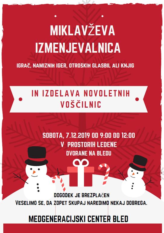 Če se vam doma nabirajo igrače, namizne igre, otroška glasbila ali knjige, ki so že dolgo pozabljene in osamljene jih prinesite v Medgeneracijski center in jih izmenjajte z drugimi otroci. Namenoma dogodek organiziramo pred decembrskimi obdarovanji, saj je menjava prijazna do naših denarnic, pa tudi trajnostno in ekološko naravnana.