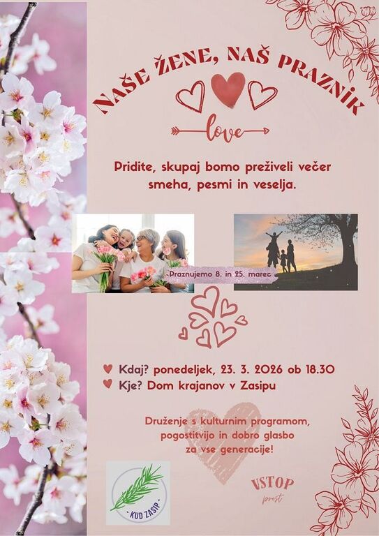 Vabljeni, da skupaj preživimo večer smeha, pesmi in veselja. Potekalo bo druženje s kulturnim programom, pogostitvijo in dobro glasbo za vse generacije.