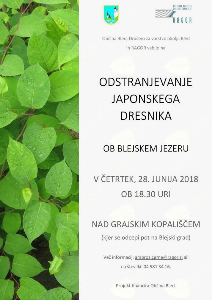 Akcija odstranjevanja japonskega dresnika v organizaciji Občine Bled, Društva za varstvo okolja Bled in RAGOR je prestavljena na četrtek, 12. 7. 2018. Zbor bo ob 18.30 uri nad Grajskim kopališčem, kjer se odcepi pot na Blejski grad.