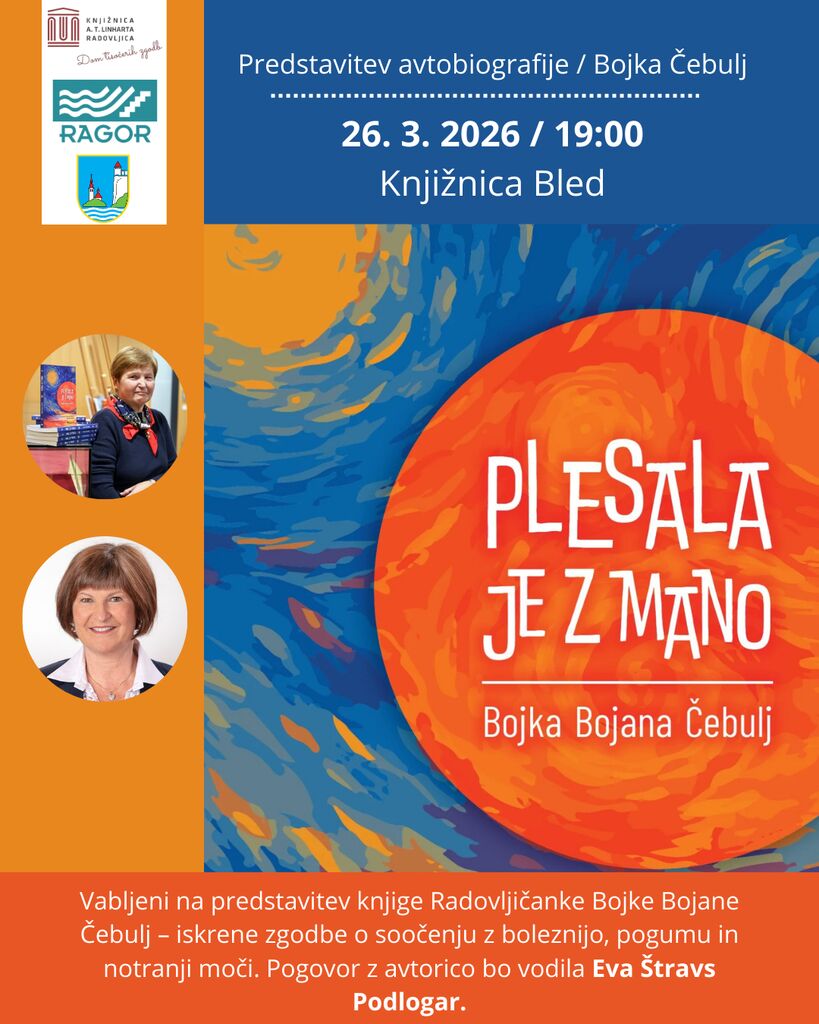 Vabljeni na predstavitev knjige, osebne pripovedi o soočenju z boleznijo ter iskanju novih poti življenja. Spoznali boste življenjsko pot Radovljičanke Bojke Bojane Čebulj, njeno iskreno izpoved ter univerzalno sporočilo o pogumu, hvaležnosti in notranji moči. Pogovor z avtorico bo vodila Eva Štravs Podlogar.