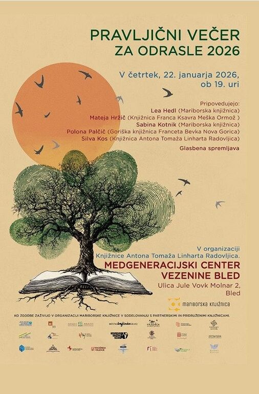 Vabljeni na čudovit pravljični večer za odrasle, kjer bomo skupaj z izjemno ekipo pripovedovalcev iz slovenskih knjižnic stopili v svet magičnih zgodb in čarobnih trenutkov. Pravljice pa bo dodatno oživela še glasbena spremljava učencev petja Glasbene šole Radovljica.