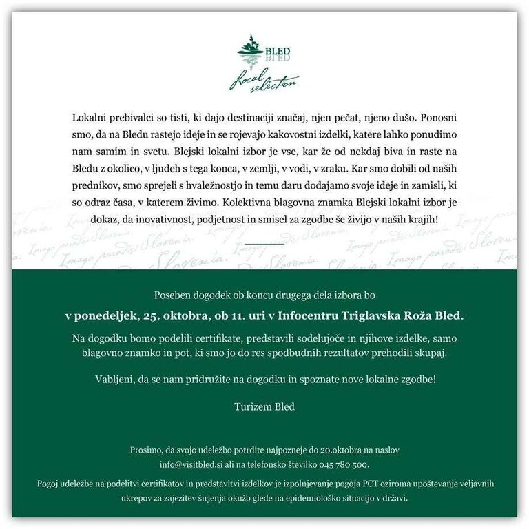 Prosimo, da svojo udeležbo potrdite najpozneje do 20. oktobra na naslov info@visitbled.si ali na telefonsko številko 045 780 500.