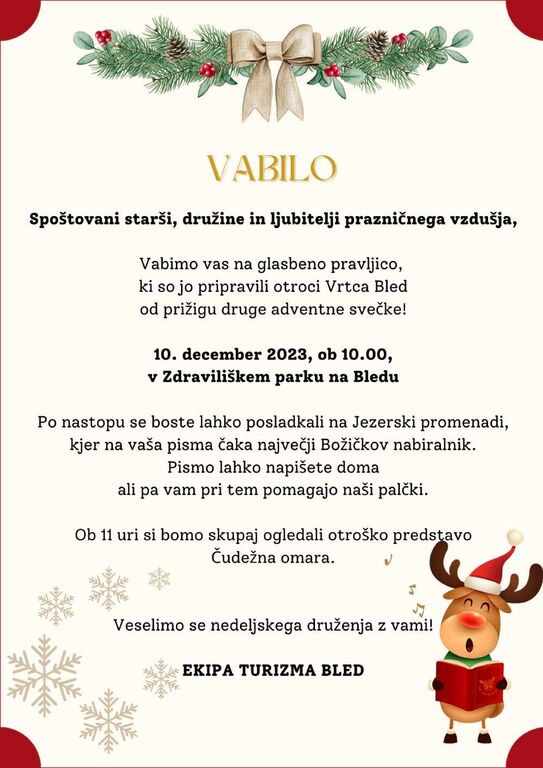 V nedeljo, 10.12. ob 10.00 uri vabljeni na prižig druge adventne svečke z glasbenim nastopom pevskega zbora Vrtca Bled v Zdraviliškem parku v okviru blejske Zimske pravljice 2023/2024.