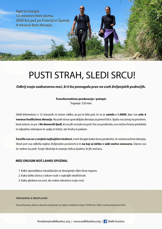 Soočila sta se s svojimi najhujšimi strahovi, med drugim kako bosta preživela, če ostaneta brez denarja. Skozi pot sta odkrila svoje življenjsko poslanstvo in na kaj se lahko zaneseta tudi v najtežjih trenutkih. Na poti ljudem pomagata, da sledijo svojemu srcu in ob tem premagajo svoje lastne strahove, dvome in nezaupanje vase.