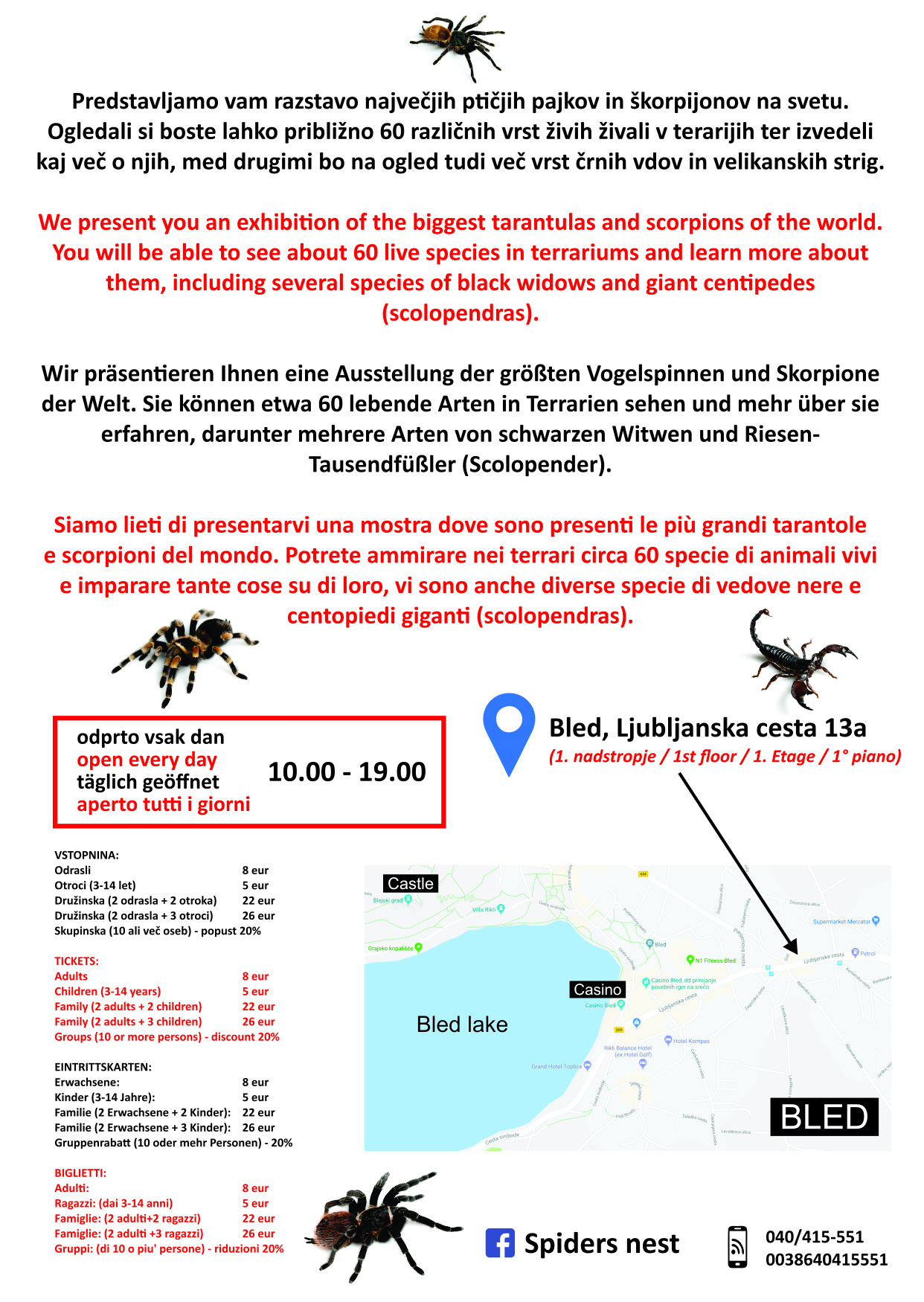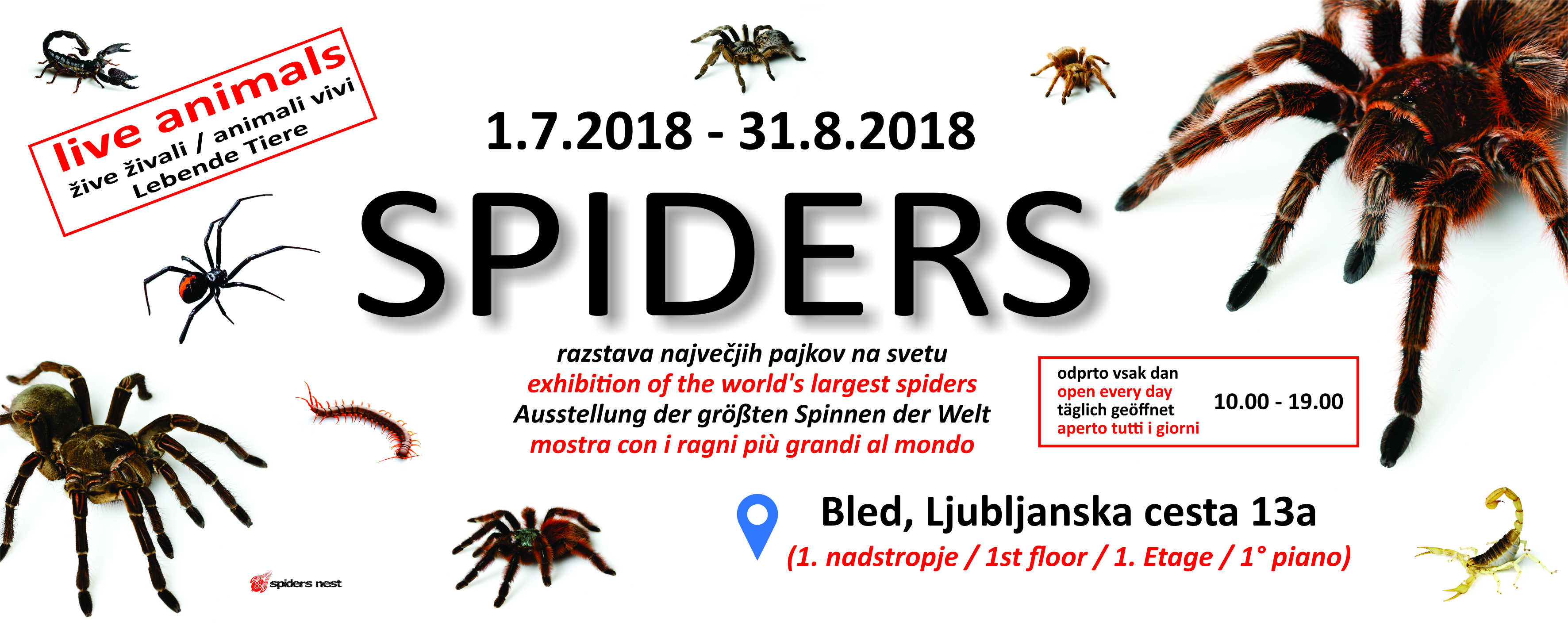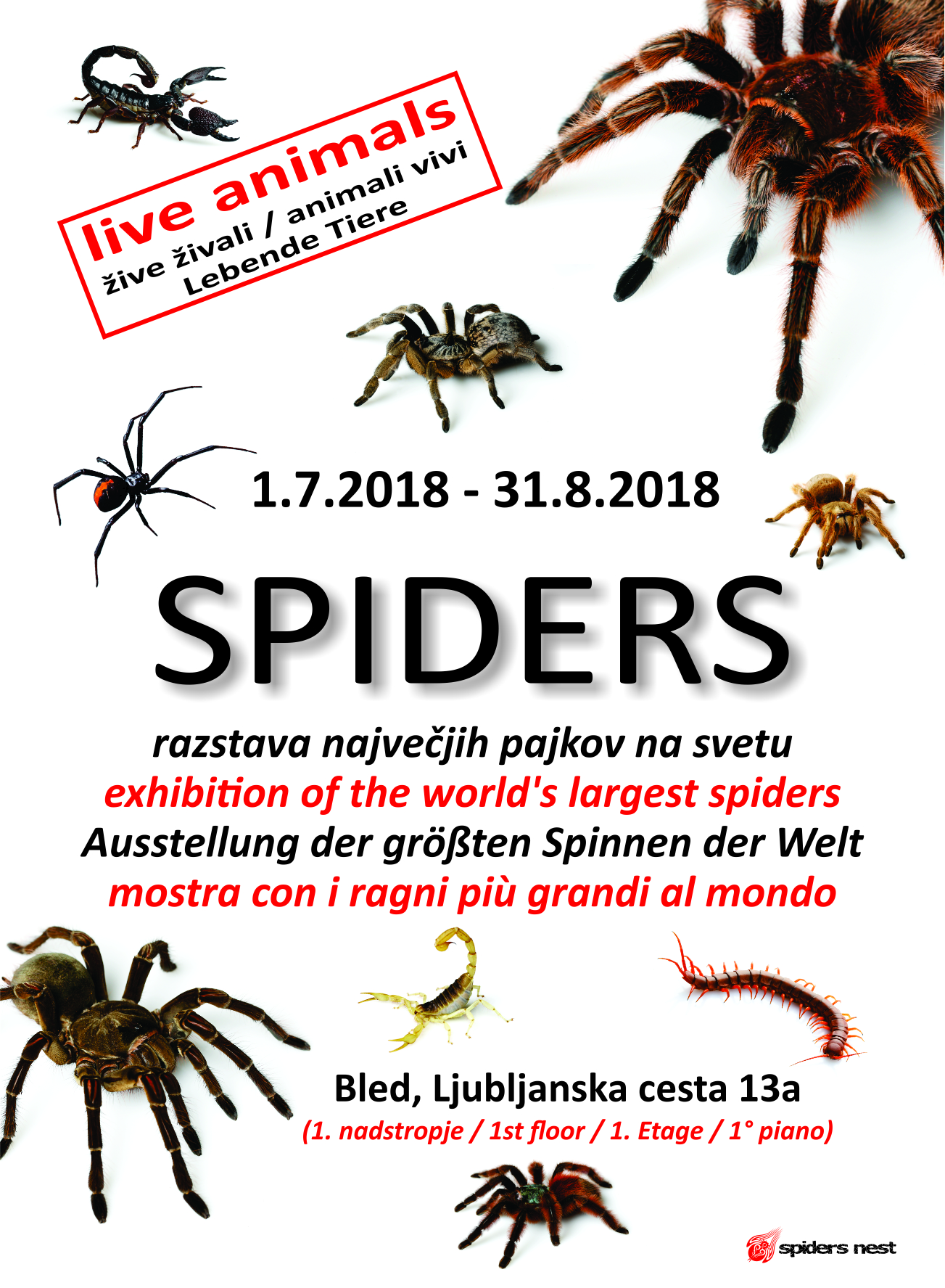 Predstavljamo vam razstavo največjih ptičjih pajkov in škorpijonov na svetu. Ogledali si boste lahko približno 60 različnih vrst živih živali v terarijih ter izvedeli kaj več o njih, med drugimi bo na ogled tudi več vrst črnih vdov in velikanskih strig.