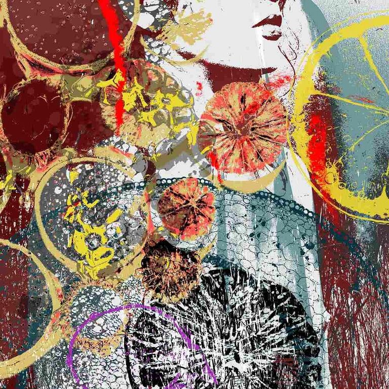 Uporaba abstraktnih in ekspresivnih elementov, poudarja vitalnost in svežino, medtem ko fragmenti človeških obrazov subtilno nakazujejo čustveno povezanost med človekom in naravo. V ospredju je ideja o ustvarjalnem procesu kot sadežu strasti, ki dozori skozi umetniško izražanje.