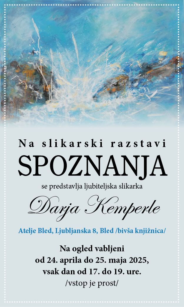 Darja Kemperle, članica Slikarskega društva Atelje Bled, ljubiteljska slikarka se bo predstavila s svojimi abstraktnimi deli na razstavi "Spoznanja".