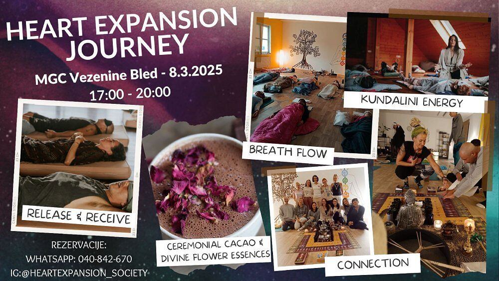 "Heart Expansion Journey" je globoko potovanje vase. Vstopili boste v energetsko napolnjen prostor, kjer bomo skozi različne tehnike sprostili naš um in telo, ter ga pripravili na prejemanje božanske kundalini energije, ki nas globoko transformira. Skozi celoten proces pustimo za sabo vse tisto, ki nam več ne služi, ustvarimo prostor v telesu za več ljubezni in življenjske energije, skozi potovanje prejmemo uvide, odgovore, dvignemo svojo vibracijo, in dobimo pogum da stopimo na pot, ki nam je zares namenjena. Za sabo spuščamo programe družbe in vzgoje ter se povežemo z svojim resničnim jazom. Pri vsem tem pa nas bo podprl kakav, ki spodbuja občutke ljubezni, radosti in veselja. Pomaga pri odpiranju našega srčnega centra. Dogodek organizirata Tamara Manojlović (učiteljica joge) in Špela Urbanc (izvajalka potovanja vase in kakavove ceremonije).