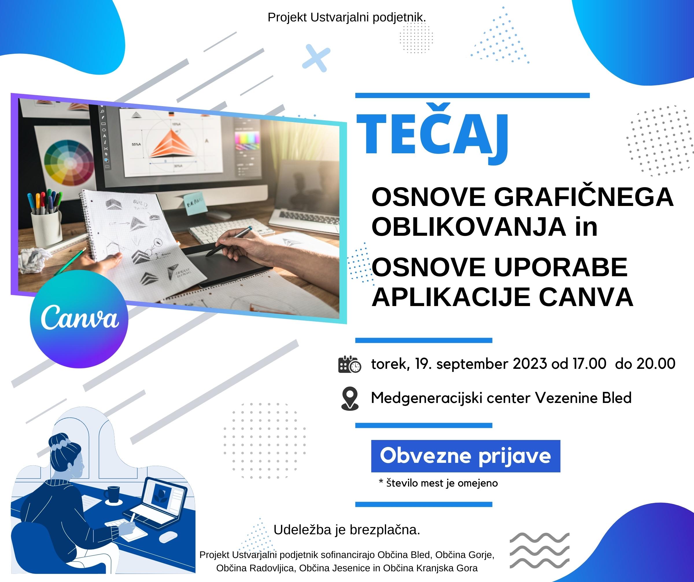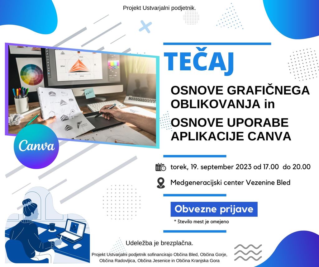 V torek, 19. 9. 2023 od 17:00 do 20:00 bo v prostorih Medgeneracijskega centra Vezenine Bled (računalniška učilnica) potekal tečaj z naslovom Osnove grafičnega oblikovanja in osnove uporabe aplikacije Canva.