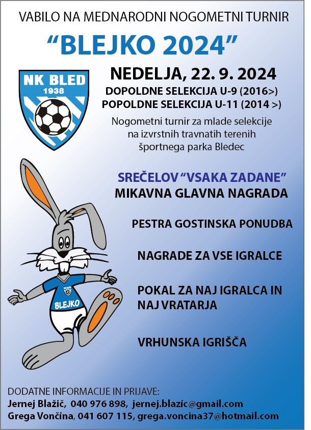 V nedeljo, 22. 9. bo Športni park Bledec gostil tradicionalni nogometni turnir Blejko 2024 za mlade igralce kategorij do 9 in do 11 let.
