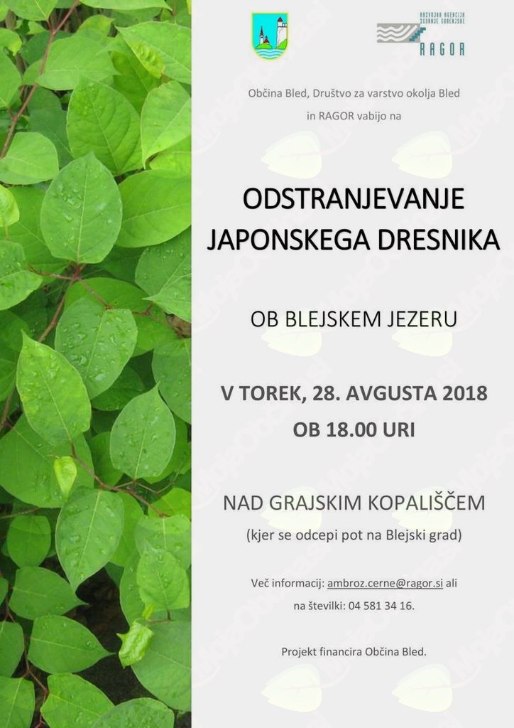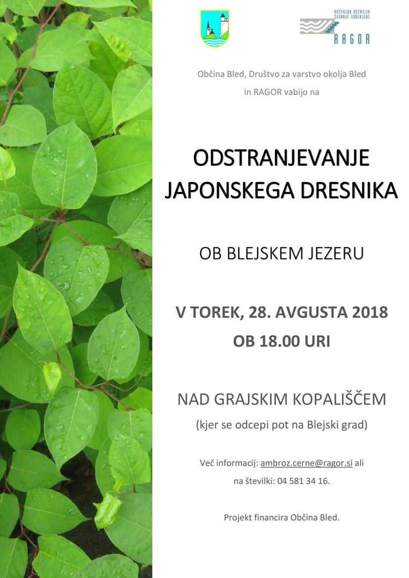 Zatorej, Vas Občina Bled, Društvo za varstvo okolja Bled in Razvojna agencija Zgornje Gorenjske vabijo na odstranjevanje japonskega dresnika ob blejskem jezeru v TOREK, 28. avgusta 2018. Zbor bo ob 18.00 uri nad grajskim kopališčem (kjer se pot odcepi na grad). Na akciji boste spoznali načine kako se soočiti s dresnikom. Zaželeno je orodje - rovke, motike. Ostalo (rokavice, vreče) prinesemo mi. Za več informacij smo na voljo preko elektronske pošte ambroz.cerne@ragor.si ali na številki 04 581 34 16. Izvedbo projekta omogoča in financira Občina Bled.