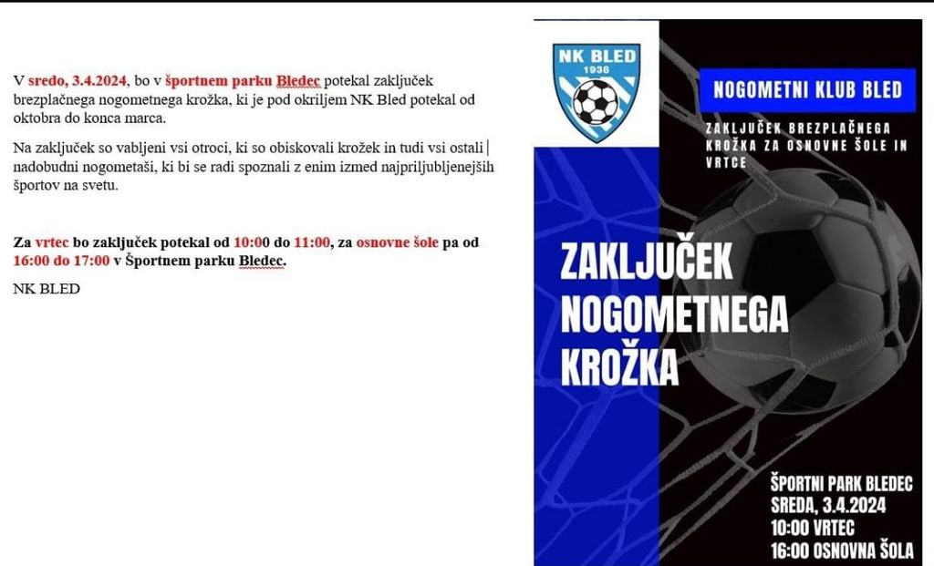 V sredo, 3. 4. 2024 bo v Športnem parku Bledec potekal zaključek brezplačnih nogometnih krožkov, ki so pod okriljem NK Bled potekali od oktobra do konca marca na osnovnih šolah, podružnicah in vrtcih.
