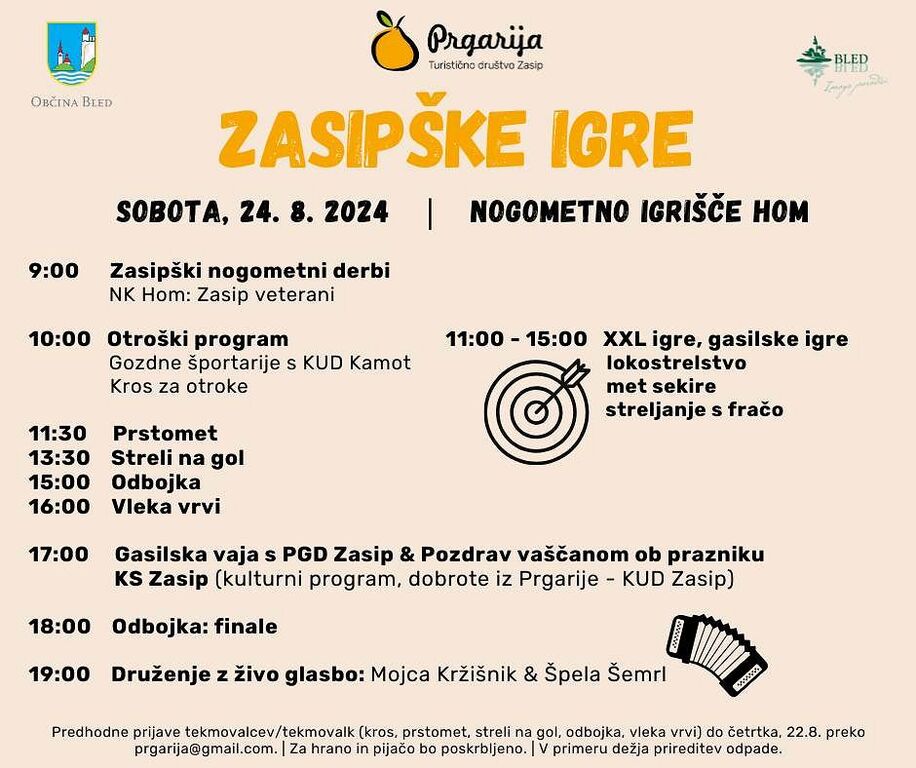 Predhodne prijave tekmovalcev/tekmovalk (kros, prstomet, streli na gol, odbojka, vleka vrvi) do četrtka, 22.8., preko prgarija@gmail.com.