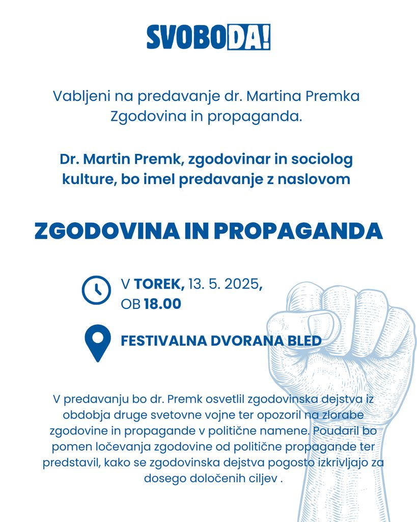 Vabljeni na predavanje doktorja zgodovine in sociologije kulture Martina Premka z naslovom Zgodovina in propaganda. V predavanju bo dr. Premk osvetlil čas druge svetovne vojne ter opozoril na zlorabo zgodovine v ozke politične namene. Vstopnine ni!