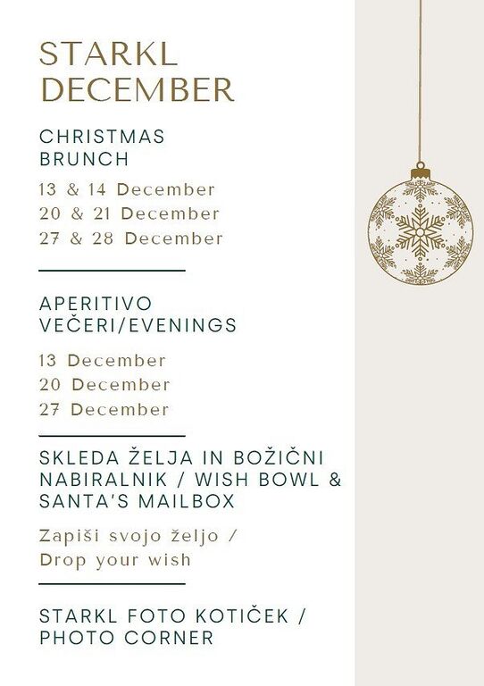 Vabljeni na Zimski brunch, ki bo potekal vsako soboto in nedeljo v decembru od 7.30 do 11.30. Cena: 18 EUR/osebo.