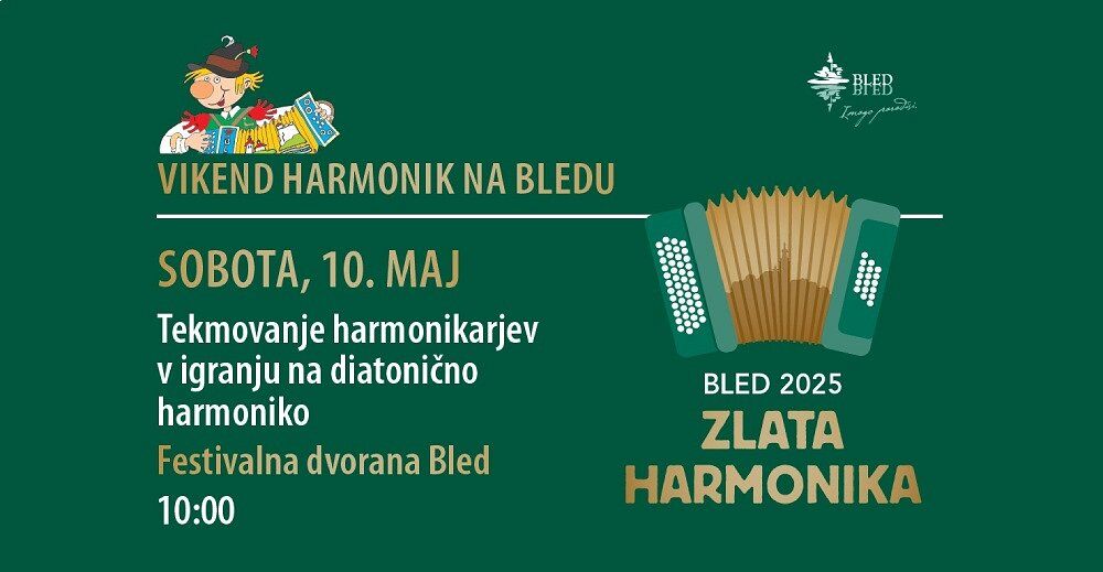Vabljeni na tradicionalno tekmovanje harmonikarjev v igranju na diatonično harmoniko - Zlata harmonika Bled 2025.Tekmovanje Zlata harmonika Bled se vključuje v praznovanje Svetovnega dneva harmonike, ki ga od leta 2009 obeležujemo vsako leto v začetku maja. Leta 1829 je 6. maja Cyrill Demian na Dunaju patentiral prvo harmoniko.