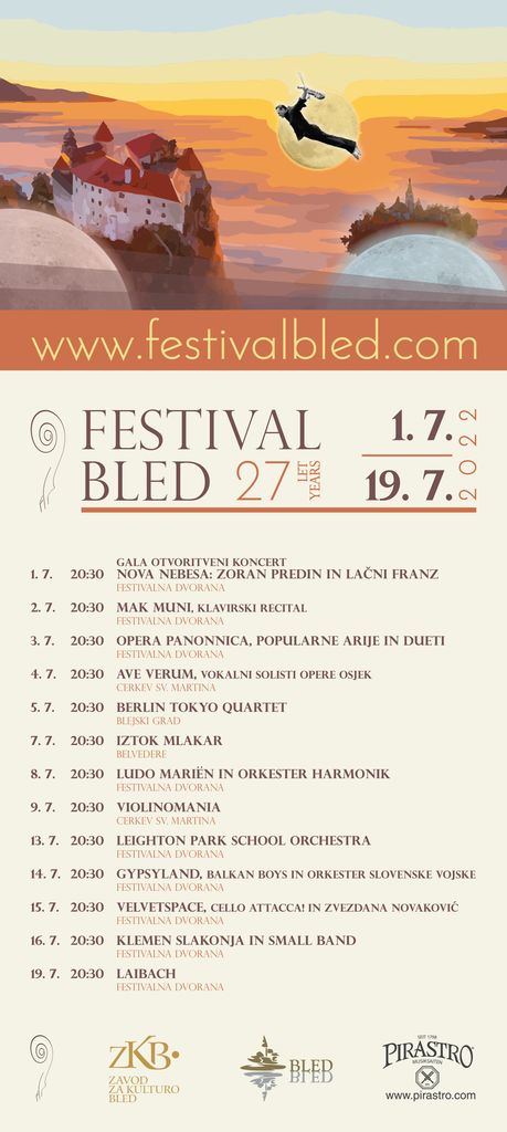Festival Bled bodo 1. 7. v Festivalni dvorani, skozi Nova nebesa otvorili Zoran Predin in Lačni Franz. Mak Muni nas bo 2. 7. razvajal s klavirskim recitalom, 3. 7. pa nas čaka izbor najpopularnejših arij in duetov Opere Panonnice. Nato se Festival seli v cerkev Sv. Martina, kjer bodo vokalni solisti Opere Osijek izvedli sakralni program. Godalni kvartet Berlin Tokio bo 5. 7. na Blejskem gradu predstavil novejšo klasično glasbo. Po nekajdnevnem premoru se vrnemo v Festivalno dvorano, kjer bo orkester klasičnih harmonik vodil ustanovitelj in dirigent Ludo Marien.