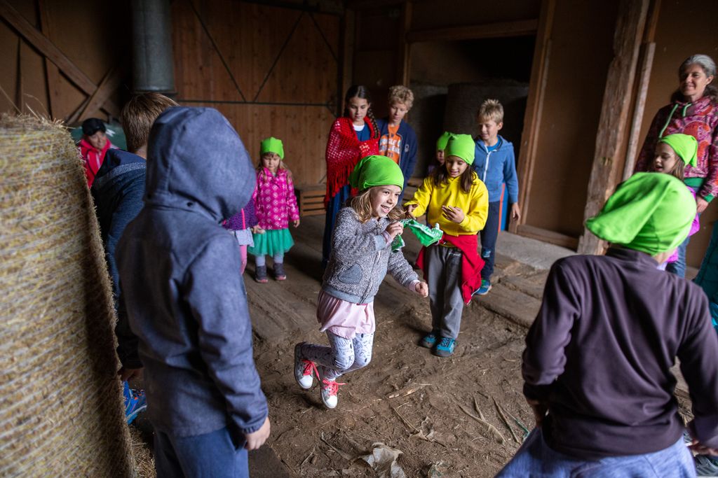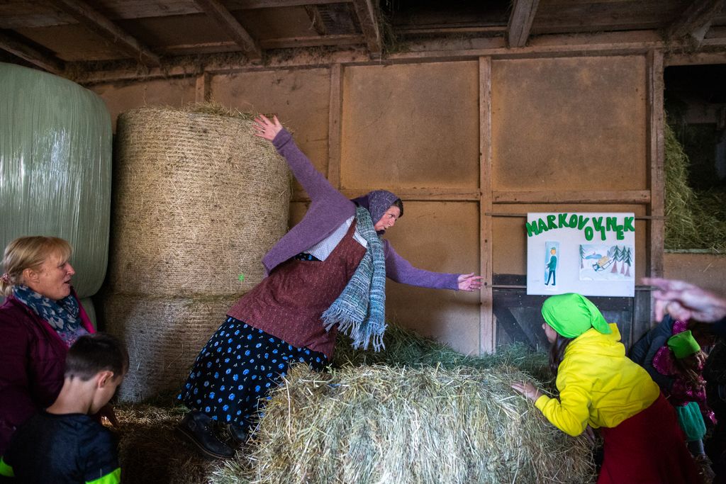 4.PR ŠNET prevoz sena s samotežnimi sanmi ob zgodbi Markov ovnk, skakanje v seno, petje