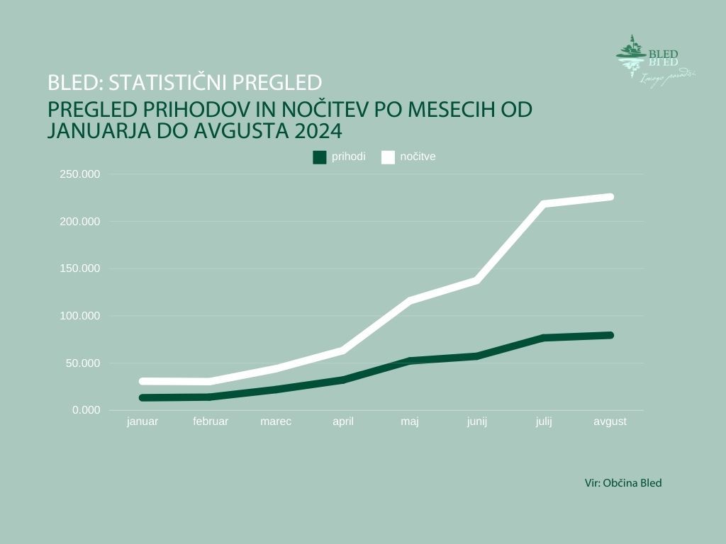V letošnjem avgustu je 79.403 gostov ustvarilo 225.924 nočitev s povprečno dobo bivanja 2,8 dneva, v enakem obdobju lani pa je 70.439 gostov ustvarilo 206.644 nočitev.