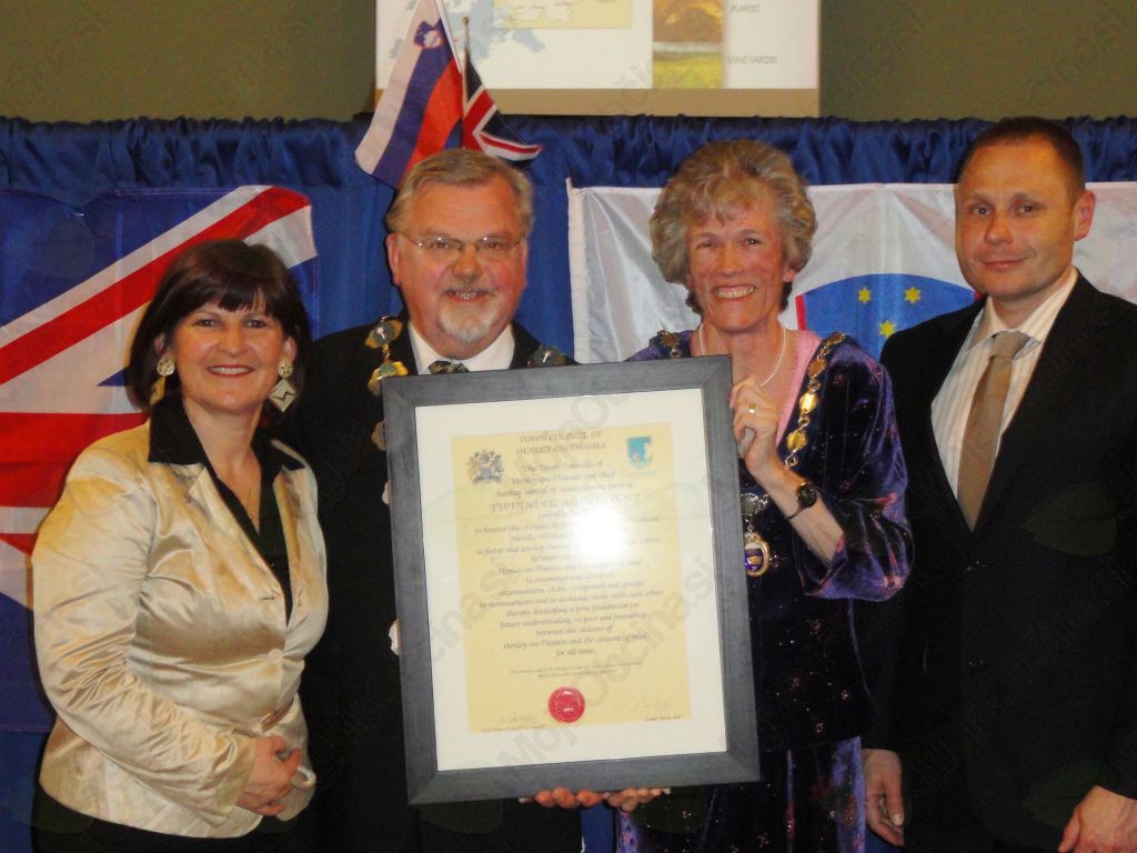 Na slavnostni seji mestnega sveta sta bila prisotna tudi oba veleposlanika, slovenski Iztok Jarc in Andrew Page, britanski veleposlanik v Ljubljani. O dogovoru je poročal tudi BBC in vključil izjave svojih najboljših veslačev, ki so obujali spomine na lepote Bleda in prvenstvo 2011. Na sliki so župan občine Bled, Janez Fajfar in županja Henleya, Elizabeth Hodgkin s podpisano pogodbo ,Jernej Slivnik, sekretar VK Bled in VZS in Eva Štravs Podlogar, direktorica Turizma Bled.