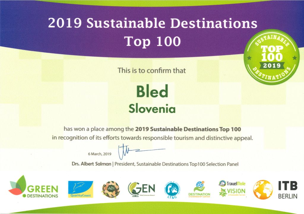 Na srečanju zelenih destinacij sveta, ki ga je letos na Hrvaškem organizirala nizozemska nevladna organizacija green destinations.org, se je Bled ponovno uvrstil med sto najbolj zelenih destinacij sveta. Letošnja nagrada je bila podeljena za odgovoren odnos do turizma.