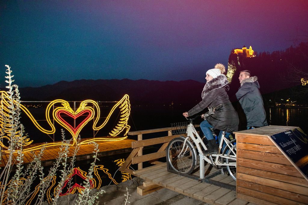 Na Jezerski promenadi bo poleg ogromnega prazničnega stola zaživel tudi kotiček za zaljubljene – Blejska ljubezenska zgodba in z njo kolesi, ki ob poganjanju proizvajata elektriko, s pomočjo katere zažarijo lučke v obliki labodov in srca. Bogato okrašene jaslice v naravni velikosti bodo umeščene v Zdraviliški park.