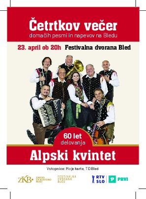 V sodelovanju s Prvim programom Radia Slovenija vas v četrtek, 23. aprila, ob 20. uri vabimo v Festivalno dvorano Bled na radijsko oddajo Četrtkov večer domačih pesmi in napevov, tokrat posvečen legendarni zasedbi Alpski kvintet, ki letos obeležuje 60 let delovanja. Ob tem se jim bomo poklonili tudi v najstarejši radijski glasbeni oddaji pri nas.