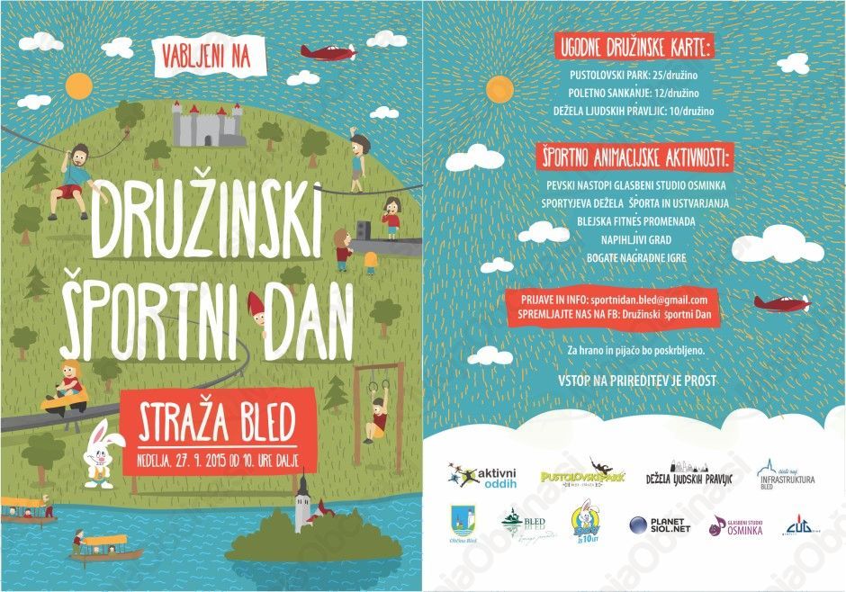 Na Straži Bled želijo po uspešni poletni sezoni ponudbo približati čim večjemu številu družin. Zato v nedeljo, 27. septembra 2015, ponovno organizirajo Družinski športni dan. Družinam bodo na voljo posamezne aktivnosti po ''noro'' ugodnih cenah, večina animacijskega programa in prav tako vstop na prireditev bo brezplačen. Tako bo vstopnina za vso družino v Pustolovski park le 25 €, za poletno sankanje 12 € in za doživetja v Deželi ljudskih pravljic le 10 €. Cel dan med deseto in šestnajsto uro bo poskrbljeno za različne športno animacijske aktivnosti. Od pevskih nastopov mladih talentov Glasbenega studia Osminka do blejske fitnes promenade, Sportyjeve športne dežele ... Posebna akcija bo namenjena vsem, ki boste na prizorišču posneli ''selfija'' in ga objavili na FB profilu Zajček Sporty... Zmagovalni fotografiji bo Zajček Sporty podaril lepo nagrado.