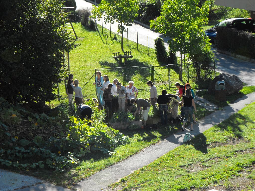 Zeliščni vrtiček v obliki devetih sončnih žarkov je zasnovala študentka Biotehniškega centra Naklo Nina Poljanec in ob pomoči prijateljev tudi oblikovala. Vrtiček smo zasadile z zelišči, precej smo jih prinesle same, nekaj pa so nam jih dobrovoljno donirali iz okoliških cvetličarn, poleg tega pa smo spet posadili buče, pa nekaj fižola, zelje in dišavnice. V mesecu maju smo pripravile še izmenjavo sadik, ki se je spet razpletla v živahen, ploden dogodek.
