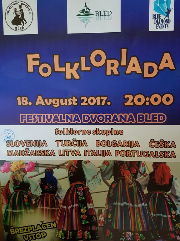 Folklorno društvo Bled v sodelovanju z Blue Diamond Events v petek, 18. avgusta, ob 20. uri v Festivalni dvorani na Bledu organizira FOLKLORIJADO s trinajstimi nastopajočimi skupinami iz Slovenije, Turčije, Bolgarije, Češke, Madžarske, Litve, Italije in Portugalske.