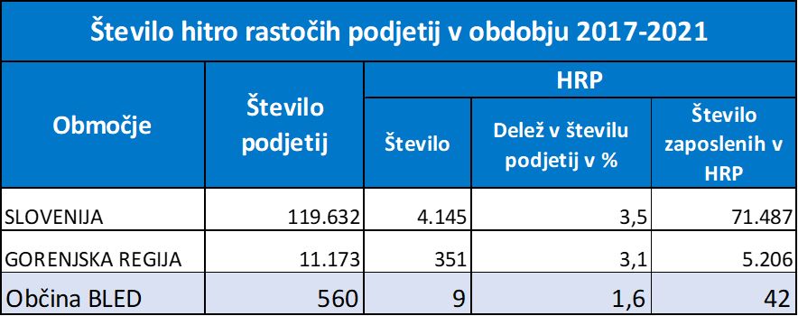 V analizo je z občine Bled vključenih 560 podjetij, med katerimi je 9 takšnih, ki izpolnjujejo kriterije za hitro rastoče podjetje. Hitro rastoča podjetja predstavljajo 1,6 % podjetij v občini, v njih pa je zaposlenih 42 delavcev.