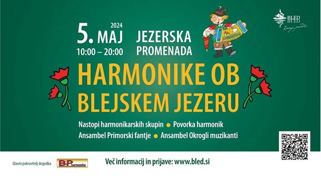 Na prvi majski vikend se bo po Bledu razgledal zvok harmonik. V soboto, 4. maja, bo potekalo tradicionalno tekmovanje harmonikarjev v igranju na diatonično harmoniko – Zlata harmonika Bled 2024, v nedeljo, 5. maja 2024, pa boste lahko uživali v nastopih harmonikarskih skupin, skupinskem nastopu več sto udeležencev ter povorki harmonik v sklopu prireditve Harmonike ob Blejskem jezeru.
