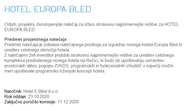 Decembra je Zbornica za arhitekturo in prostor na svoji spletni strani objavila izid odprtega dvostopenjskega natečaja za izbiro strokovno najprimernejše rešitve za Hotel Europa Bled. Z natečajem je investitor želel pridobiti strokovno najprimernejše rešitve za ureditev celotnega kompleksa hotela EUROPA BLED na Rečici, ki bodo ob upoštevanju usmeritev prostorskih aktov, pogojev ZVKDS, programskih in funkcionalnih izhodišč v največji možni meri upoštevale programsko trženjski koncept hotela.