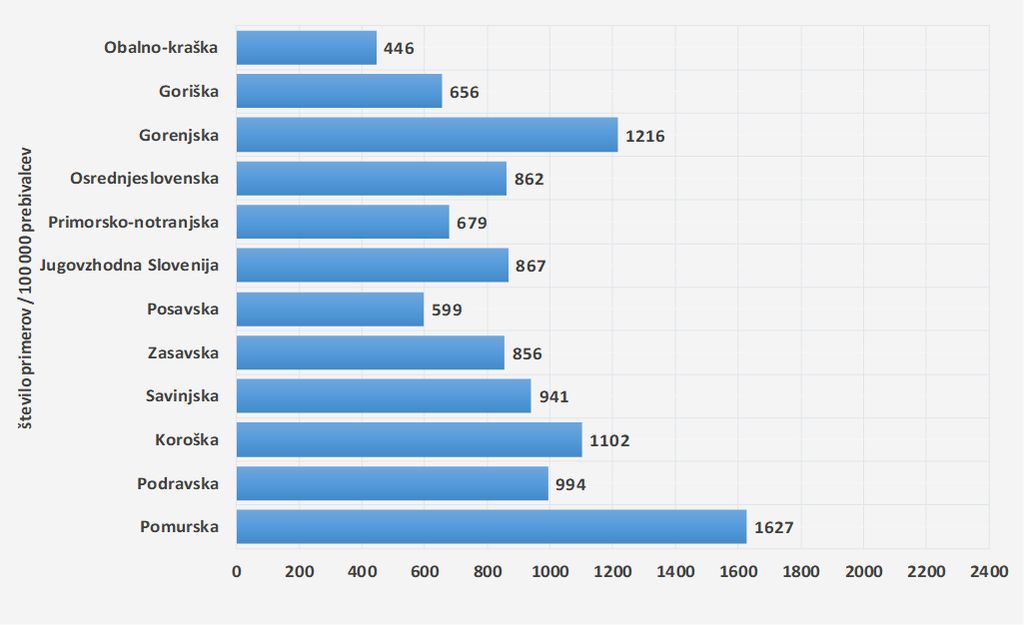 Kljub temu, da že nekaj dni poročamo, da se epidemija na Gorenjskem umirja, podatki NIJZ o štirinajstdnevni incidenci na 100.000 prebivalcev kažejo, da je Gorenjska še trdno na drugem mestu po regijah v Sloveniji. 14-dnevna incidenca na 100.000 prebivalcev na Gorenjskem je 1216, vodi pa Pomurje 1627 okuženimi. Na tretjem mestu je Koroška s 1102 okužbama, najmanj okuženih pa je v obalno-kraški regiji, 446.