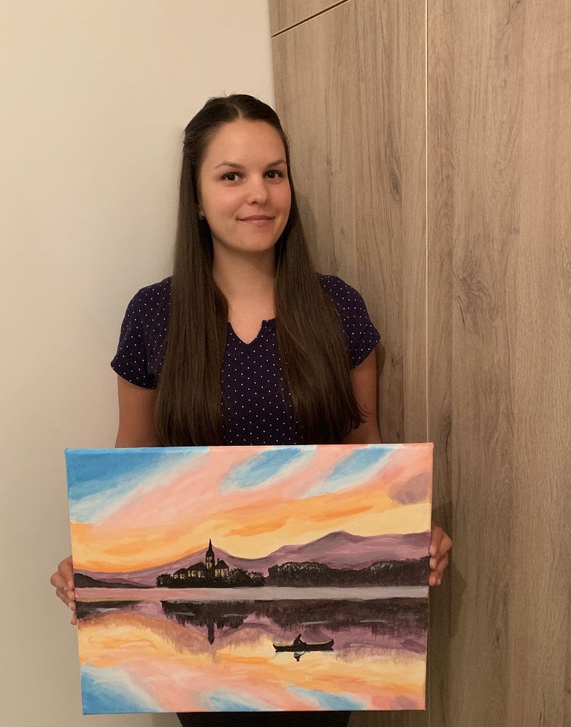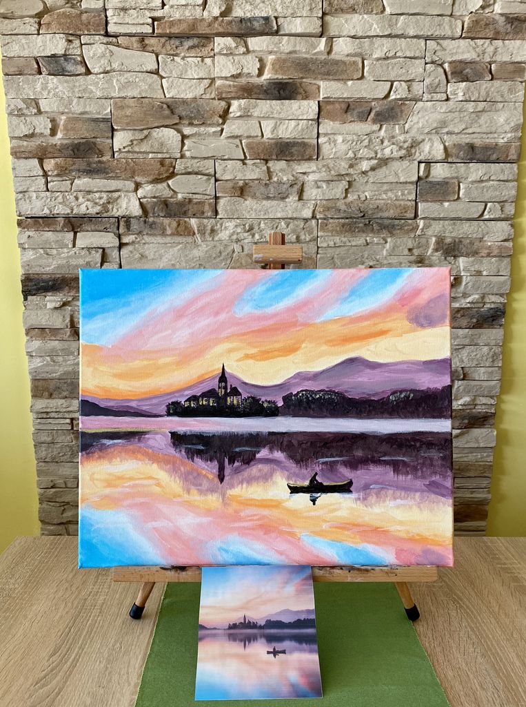 Pred nekaj dnevi sem razmišljala o tem, kaj bi v teh težkih časih lahko počela. Našla sem madžarsko spletno stran, ki je ponujala tri urni on-line tečaj risanja, ki je potekal tako, da si za svojo sliko lahko kot predlogo izbral fotografijo. Našla sem fotografijo sončnega zahoda na Bledu, takoj mi je bilo jasno, da bom s tem obudila spomine na Slovenijo.