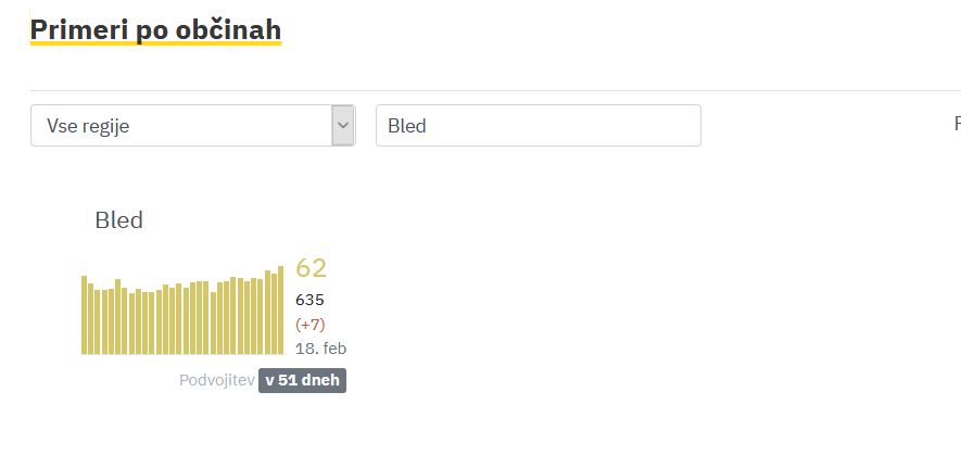 Po podatkih covid sledilnika (https://covid-19.sledilnik.org/sl/stats) so v četrtek, 18. februarja, v občini Bled potrdili sedem novih okužb.