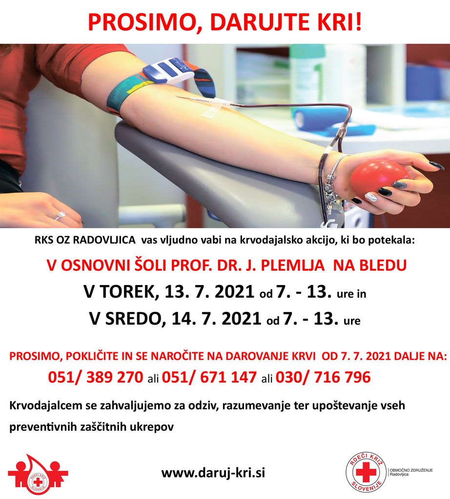 RKS OZ Radovljica organizira krvodajalsko akcijo, ki bo 13. in 14. julija v prostorih blejske osnovne šole. Akcija bo potekala od 7. do 13. ure. Vsi pomembni podatki so na priloženi fotografiji.