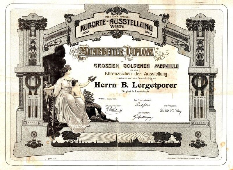 Najdragocenejši predstavljeni artefakt razstave je bil relief blejske sklede, ki ga je iz zapuščine barona Schwegla uspel rešiti in ohraniti g.Zdravko Rus z Bleda. Izdelal ga je prav vsestranski fotograf, planinec, kulturni in turistični delavec ter geoplast Benedikt Lergetporer in ga skupno z več kot 1500 fotografijami naše lepe dežele, nalepljenih na trdih kartonih, ki so se od 12. do 20. oktobra leta 1903 brezplačno delili obiskovalcem, takrat predstavil na znameniti dunajski razstavi zdraviliških krajev. Bled je prejel veliko zlato medaljo za najlepši zdraviliški kraj avstrijske monarhije, prav tako pa je istočasno tudi Lergetporer prejel veliko zlato medaljo za pripravo te razstave. Dogodek so najavili tudi v Političnem in gospodarskem listu Gorenjec 5. 9.1903, kjer so med drugim zapisali: „Imenovane razstave udeleži se tudi naše zdravišče. Glavno kar razstavimo je ploskorezba, ki predstavlja divno našo okolico s Triglavskim pogorjem. Ploskorezba je last g. barona Schwegla in jo je izdelal podjetni tukajšnji fotograf g.B.Lergetporer.“