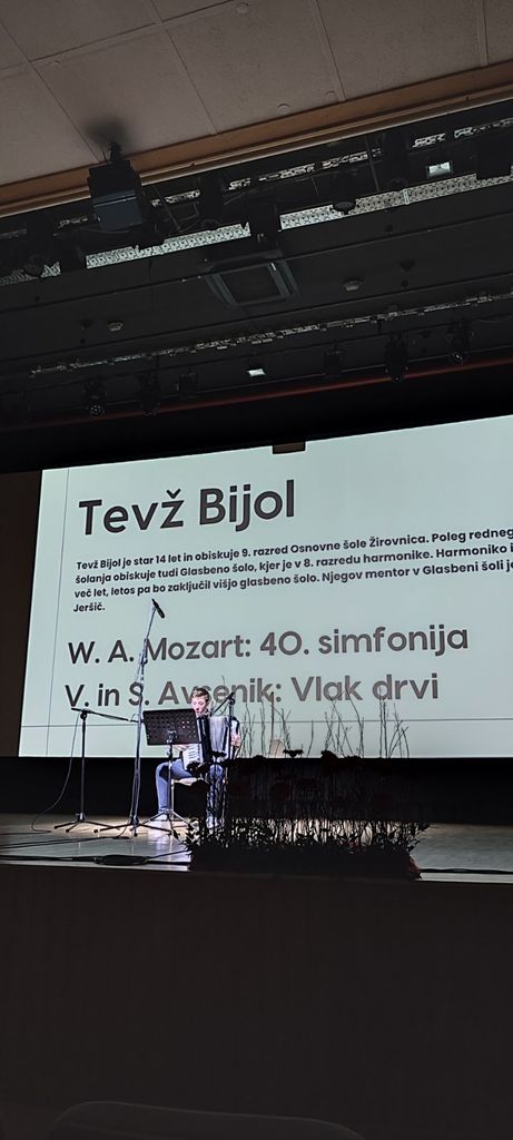 Tevž Bijol, star 14 let in obiskuje 9. razred Osnovne šole Žirovnica. Poleg rednega šolanja obiskuje glasbeno šolo v Radovljici, kjer je v 8. razredu harmonike. Harmoniko igra že več let, letos pa bo zaključil višjo glasbeno šolo. Njegov mentor je gospod Mitja Jeršič.