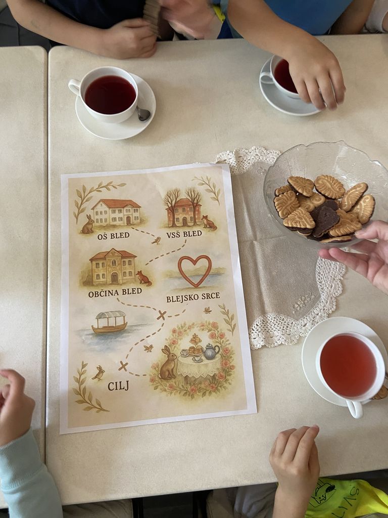 Dan pred čajanko so učenci prejeli presenečenje: pismo Zajčka, ki jih je skupaj z ročno ilustriranim zemljevidom povabil na »lov na zaklad«. Sledili so poti mimo občinskih znamenitosti vse do čajnice Jasmin, kjer jih je pričakala skrbno pripravljena čajanka.