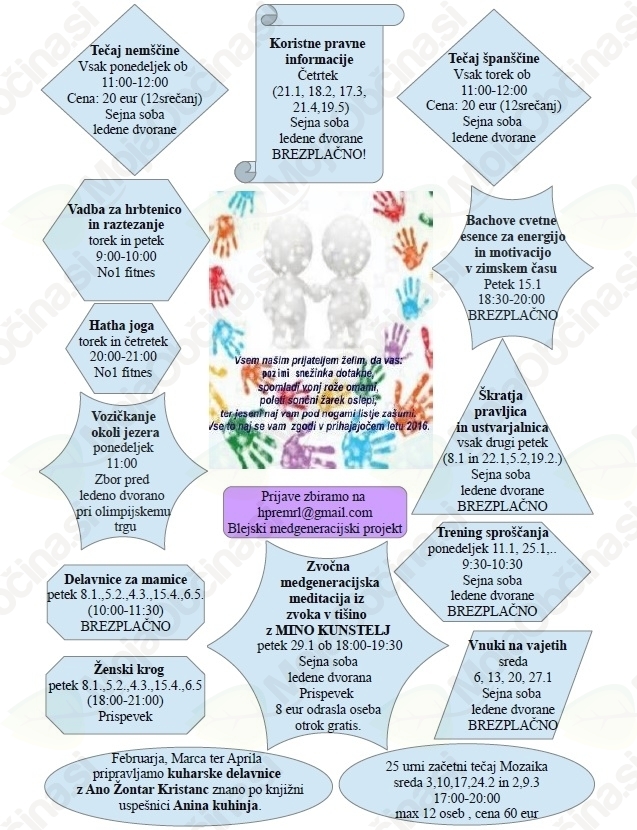 Z dejavnostmi v okviru projekta nadaljujemo že 4. Januarja. Za udeležence pripravljamo kar nekaj novosti torkove dopolneve bomo popestrili z začetnim tečajem španskega jezika, večere pa s Hatha jogo. Petki bodo rezervirani za druženja (delavnice za mamice in Ženski krog) ter sprostitve (15.1 predavanje Bachove cvetne esence za energijo in motivacijo v zimskem času, 29.1 zvočna medgeneracijska meditacija iz zvoka v tišino). Prav tako smo otroške ustvarjalnice prestavili na petke, tako da se bomo dopolnjevali s Knjižnico Blaža Kumerdeja Bled. Za maice z vozički vask ponedeljek organiziramo vozičkanje okoli jezera.