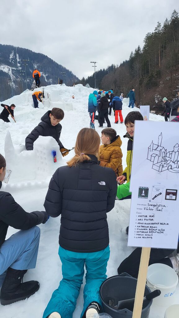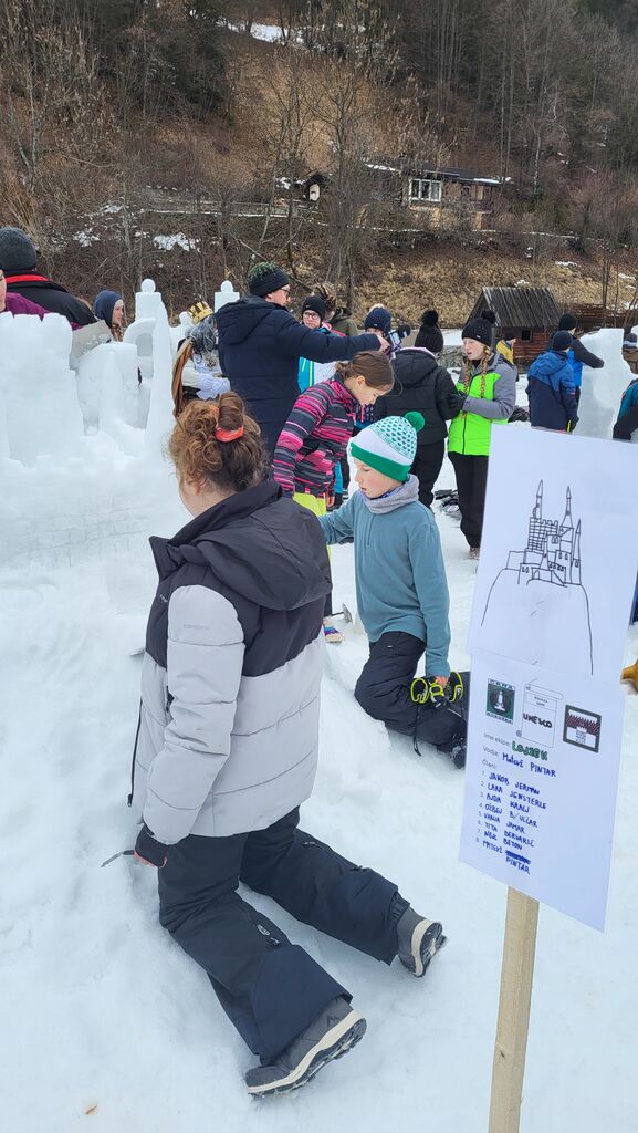 Zadnji konec tedna v januarju smo se z učenci naše šole udeležili prav posebnega dogodka – tradicionalne prireditve Gradovi kralja Matjaža, ki je potekala v Črni na Koroškem. Osnovna šola Črna je k sodelovanju povabila UNESCO šole, povabilu pa smo se z veseljem odzvali tudi mi. Na prireditvi je sodelovalo kar devet šol, kar je dogodku dalo še poseben pomen, saj so se učenci lahko povezovali, sodelovali in izmenjevali izkušnje z vrstniki iz različnih krajev. Na pot smo se odpravili z dvema ekipama, skupaj 16 učenci, večinoma člani otroškega parlamenta, ki so s svojo zagnanostjo, ustvarjalnostjo in sodelovalnostjo odlično zastopali našo šolo. V petek po pouku smo se z avtobusom odpravili proti Koroški. Po prihodu v Črno smo se najprej udeležili slavnostne otvoritve, sledile pa so zanimive in raznolike UNESCO delavnice, ki so učencem ponudile vpogled v lokalno dediščino, ročne spretnosti in ustvarjalnost. Učenci so z navdušenjem izdelovali magnetke in knjižne kazalke ter se preizkusili v pripravi tradicionalnih koroških kvočevih nudlov, polnjenih z mletimi sušenimi hruškami, ki so pomemben del kulinarične dediščine Koroške. Ob tem so spoznavali pomen ohranjanja kulturne dediščine, vrednote, ki jih UNESCO šole še posebej poudarjamo. Popoldan smo namenili sprostitvi in druženju. Odpravili smo se na večerni sprehod do smučišča, kjer je potekala smučarska tekma za pokal kralja Matjaža. Dogajanje je bilo živahno, vzdušje pa pravo zimsko in praznično. Po večerji so se učenci lotili resnega dela – risanja skic gradov, ki so jih nameravali graditi naslednji dan. Večer smo zaključili z razgibavanjem v telovadnici, nato pa so učenci prespali kar v šolskih učilnicah, kar je bila za mnoge prav posebna izkušnja. Naslednje jutro nas je čakal osrednji del prireditve. Po zajtrku smo se opremili z orodjem in se odpravili na prizorišče, kjer se je ob 10. uri začela gradnja snežnih gradov. Vsaka skupina je imela svojo idejo in vizijo, zato so nastali unikatni in izvirni gradovi, ki so odražali timsko delo, domišljijo in vztrajnost učencev. Delo ni bilo lahko, sneg je bilo treba znositi z velikega kupa do posameznih gradbišč, kar je zahtevalo veliko fizičnega napora, dobre organizacije in medsebojne pomoči. Organizatorji so med gradnjo poskrbeli tudi za okrepčilo, pica je vsem hitro povrnila energijo, da smo lahko delo uspešno zaključili. Ob 14. uri smo se vrnili nazaj do šole, kjer so se učenci, premočeni do kože, najprej preoblekli, nato pa smo spakirali in se poslovili od izjemno prijaznih in zavzetih organizatorjev, ki so poskrbeli, da je dogodek potekal brezhibno. Polni vtisov, novih izkušenj in lepih spominov smo se z avtobusom odpravili proti domu. Dogodek Gradovi kralja Matjaža je učencem ponudil mnogo več kot le gradnjo iz snega, bil je priložnost za učenje izven učilnice, za sodelovanje, povezovanje, spoznavanje kulturne dediščine ter krepitev odgovornosti in skupinskega duha. Za vse nas je bila to zanimiva, poučna in nepozabna izkušnja, ki jo bomo še dolgo nosili v spominu. Veseli smo, da smo lahko bili del te zgodbe in ponosni na učence, ki so našo šolo odlično predstavili.